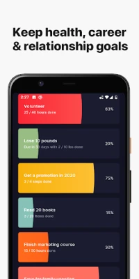 A Higher Goals alkalmazás segítségével élete minden fontos területén nyomon követheti fejlődését. Könnyedén menedzselheti fizikai és mentális egészségét a napi vízfogyasztás, a rendszeres edzés és a meditáció beütemezésével. Erősítse meg családi kapcsolatait minőségi időtöltéssel vagy apró figyelmességekkel. Fektessen önmagába, legyen szó könyvolvasásról, online kurzusok elvégzéséről az AI, kódolás, írás, tervezés, marketing vagy pénzügy területén, vagy építse karrierjét OKR-ek és KPI-ok nyomon követésével. Még a vagyonépítés és a pénzügyi célok felé vezető utat is részletes lépésekre bonthatja, miközben a gondolkodásmód-követő segítségével a bőség irányába tereli gondolatait. Az app a „vezércsillag" filozófia mentén segít azonosítani és kiemelten megjeleníteni az igazi prioritásait.